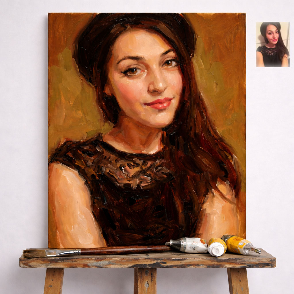 A refined and timeless artwork, this hand-painted oil portrait is created using traditional techniques that bring depth, warmth, and authenticity to every detail. Each piece is carefully crafted by hand, transforming your chosen photo into a true work of art with rich textures and expressive brushstrokes.